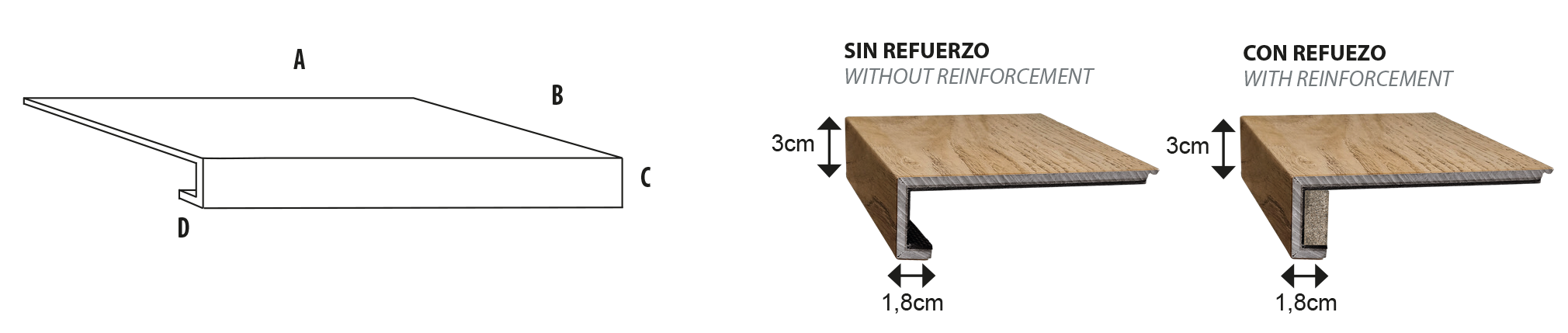 El peldaño GRADONE con refuerzo es ideal para recubrir escalones que no tienen mamperlán de origen y se quiere ampliar la superficie de la huella. Permite continuidad con el pavimento y un cambio estetico rápido y limpio.